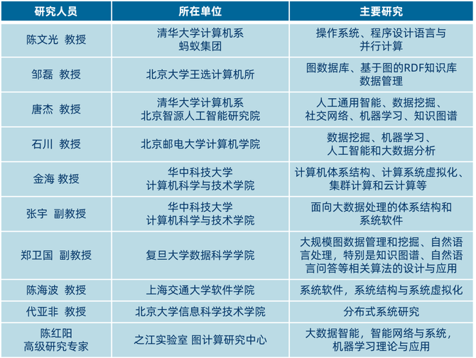 下表为国内图计算领域的部分研究学者,主要研究领域横跨了图数据、操作系统、人工智能、大数据、分布式系统等,他们不仅在基础理论层面研究深耕,也在产业化实践方面不断更迭创新,助力图计算在大数据的沃土里生根发芽。