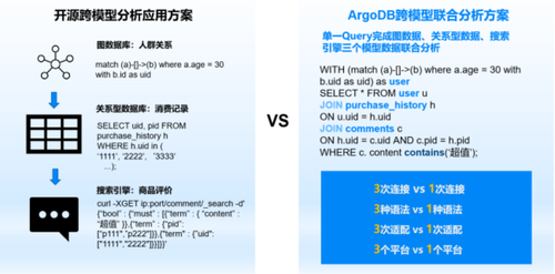 ArgoDB 通过统一的元数据管理、统一的事务管理和完备的多模优化器支撑了对不同模态数据的统一读取调度,支持跨模型联合分析,满足更多“一库多用”场景。例如传统反欺诈解决方案由于不同数据模型分散存储在不同的数据库(例如关系型数据库和图数据库)等原因,在实际业务中需要大量数据转换操作,应用实施成本高,实时性有待提高。ArgoDB为解决此类业务中的数据关联难问题,将多模型数据存储、数据融合处理能力进行迭代加强,用户可将关系型数据和图数据库进行统一存储,用户只需通过一个 SQL 即可关联查询分析关系型数据和图数据,在数据免搬迁、减少人工操作的同时,提升业务效率。