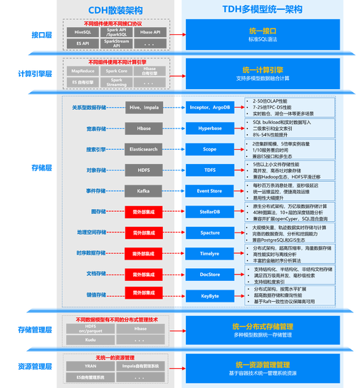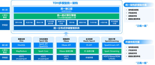 与CDH散装架构相比,TDH统一的多模型架构具有复杂度低、开发成本低、运维成本低、数据处理效率高等优点。