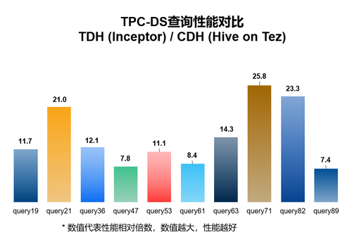 Inceptor是星环科技自主研发的关系型分析引擎,基于TPCDS 1TB的数据规模,同等配置下(4X10cores),基于以下不同查询分析场景下,TDH(inceptor)性能是CDH(Hive on Tez)的7~25倍。