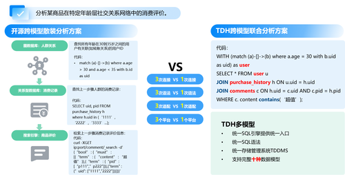 基于星环科技的多模型统一技术架构,用户只需用一句SQL就能同时访问这3种存储模型进行联合分析,替代了之前3段代码。一句SQL里,同时对图数据人群关系表,关系型数据消费记录表,全文数据商品评价表,3个表进行了跨模型关联,一次操作完成了之前三次操作才能完成的业务,大大简化了开发复杂度,简化用户操作。同时数据也仍保留在原存储引擎中,也不用对数据进行导入导出或者转换,不会存在数据不一致或数据冗余存储的问题。