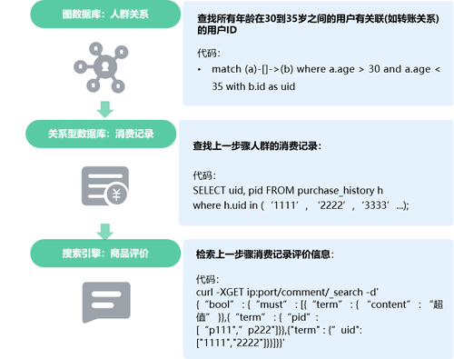 比如当用户需要研究某特定年纪人群消费习惯和喜好时,可以通过将该人群消费的商品评价作为一个参考。为了获得该人群对某商品的评价数据,用户需要单独搭建3个独立的数据库,如单独部署图数据库,关系型数据库和搜索引擎。为了完成此次业务,用户需要进行三次检索,并需要使用到图数据库中的人群关系型数据,关系型数据库中的人群消费记录数据,以及搜索引擎中消费商品评价数据。