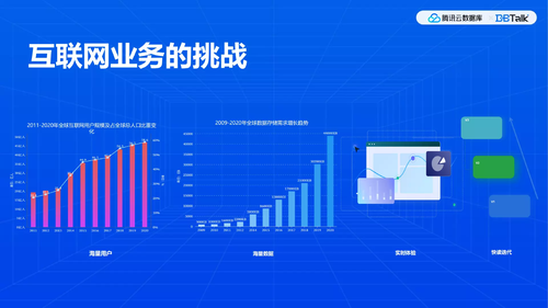 首先是用户量越来越大。跟传统的银行的交易系统相比,服务的人很多,但其实并发量并不高,而互联网业务到2020年已占到几十亿人口的比重,量越来越大,我们将其归纳为海量用户。