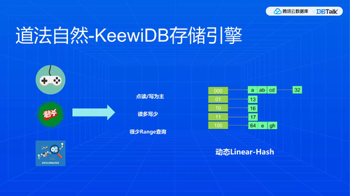 腾讯云数据库最后的选型就是动态线性哈希,动态hash分为两种:Extendible Hash和linear Hash,每次只扩一个,这里是从2个Bit扩到3个Bit,不够用了再扩到100,会从000那里拆出一半过来,按照Hash Bit拆出一部分。如此一来有个好处,即只会扩一个位置,其实是一个渐进式的扩展概念,对延迟更加平稳,我们觉得这是一个比较好的方法,至少适合腾讯云作为主引擎不错的一个选择。