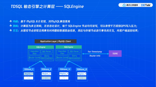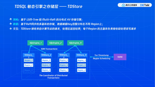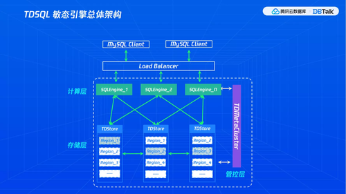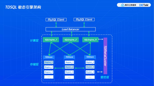 绿色这一层就是我们的计算引擎,也就是SQL Enginne,这是多写架构,每一点都可以独立响应读写请求,然后这些计算节点接收到用户的任务以后会根据用户数据、根据自己路由,就是管控层获取的实际路由分布,把请求发送到下面分布式存储层TDStore,其实就是腾讯内部自研的一款分布式存储引擎,作为能够完全符合MySQL标准的引擎版本,相当于替代了原生,直接嵌入MySQL下面作为分布式KV。