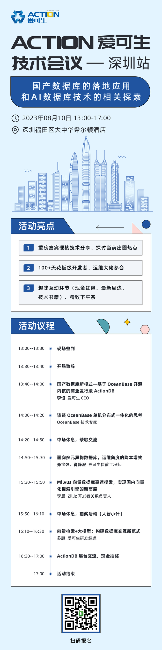 2023年8月10日,爱可生将在深圳开启技术会议第一站“国产数据库的落地应用与AI数据库技术的相关探索”,届时,我们将邀请 OceanBase 技术专家、Zilliz 开发者关系负责人与开发者们共同探讨数据库新趋势。此外,我们还将分享云树®数据库软件 ActionDB(基于 OceanBase 开源内核的商业发行版) 及向量数据库 TensorDB 最新版本技术特性,交流场景探索和创新成果。期待您的参与!