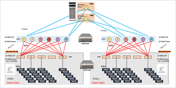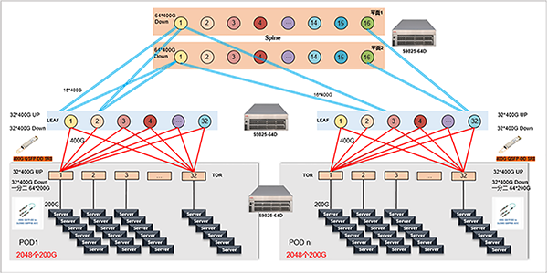 盒盒组网:以当前主力的GPU服务器100G/200G/400G网卡速率而言,新华三采用最新的S9825/S9855等系列三层ToR/Leaf/Spine组网架构为例,Spine采用双平面并且保证ToR上下行收敛比满足1:1要求。在服务器接入速率400G下单PoD可以支持1024台服务器,集群可以提供2048台400G服务器规模接入;若采用200G速率则可以提供单PoD支持2048台服务器,集群最大支持32个PoD理论可满足6.5万台服务器规模接入;若采用100G速率接入则可以满足集群最大可超过十万台服务器规模接入。
