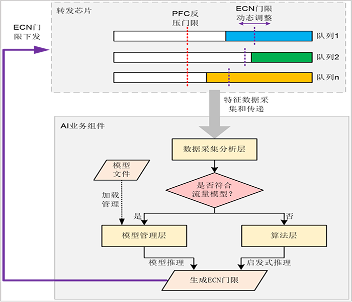 智算中心的服务模式从提供算力为主向提供“算法+算力”转变,在智能无损网络中同样需要AI无损算法加持。无损网络中各个队列转发的数据流量特征会随时间动态变化,网络管理员通过静态设置ECN门限时,并不能满足实时动态变化的网络流量特征。新华三无损网络交换机支持AI ECN功能利用设备本地或分析器上的AI业务组件,按照一定规则动态优化ECN门限。其中,AI业务组件是实现ECN动态调优的关键,是内置在网络设备或者分析器中的系统进程,它主要包括三个层次的功能框架: