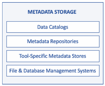 元数据存储包括用于存储元数据的技术和存储元数据的位置。(见图5。)这些通常包括数据目录、元数据存储库、特定于工具的元数据存储以及文件和数据库管理系统(包括电子表格-一种常见但不理想的做法)。