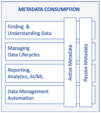 元数据消费涵盖了人们、软件和计算机处理使用元数据的各种方式。(见图7。)元数据可以主动使用-即流程访问元数据并使用它来做出运行时决策。它也可以被动使用-人类访问以了解数据并做出有关如何使用数据的决策。