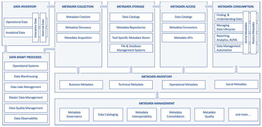 这种架构视图作为一种思考工具——一种开始了解元数据管理的范围和复杂性的方法。它并不能解决所有元数据管理挑战。它是一个开始——而不是结束——并且是一种开始寻找元数据孤岛、元数据差异、自助数据困难、数据目录采用不佳以及许多其他元数据挑战的解决方案的工具。