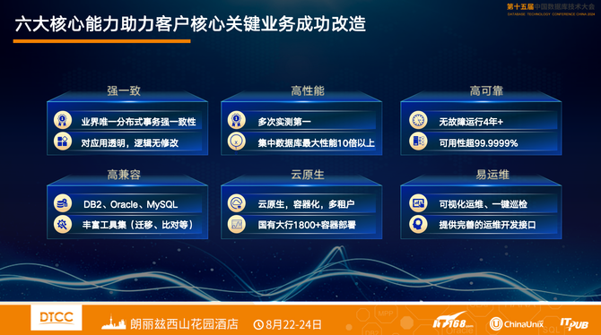 经过五年的精心筹备与不懈努力,2019年,我们成功助力中信银行完成了信用卡核心系统向分布式架构的迁移,此举标志着,中信银行成为国内首家完成核心业务分布式架构转型的大型银行。