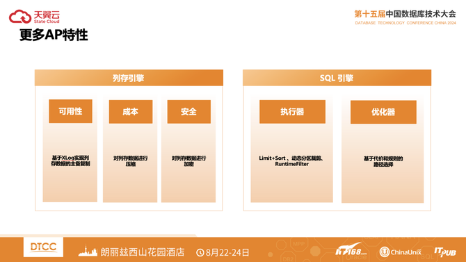 在第15届中国数据库技术大会(DTCC2024)上,天翼云科技有限公司的资深研发专家胡彬,基于自己和团队在天翼云的技术实践经验,发表了题为《天翼云分布式数据库实时分析引擎详解》的演讲,介绍了TeleDB在分析型查询性能提升方面的工作成果。