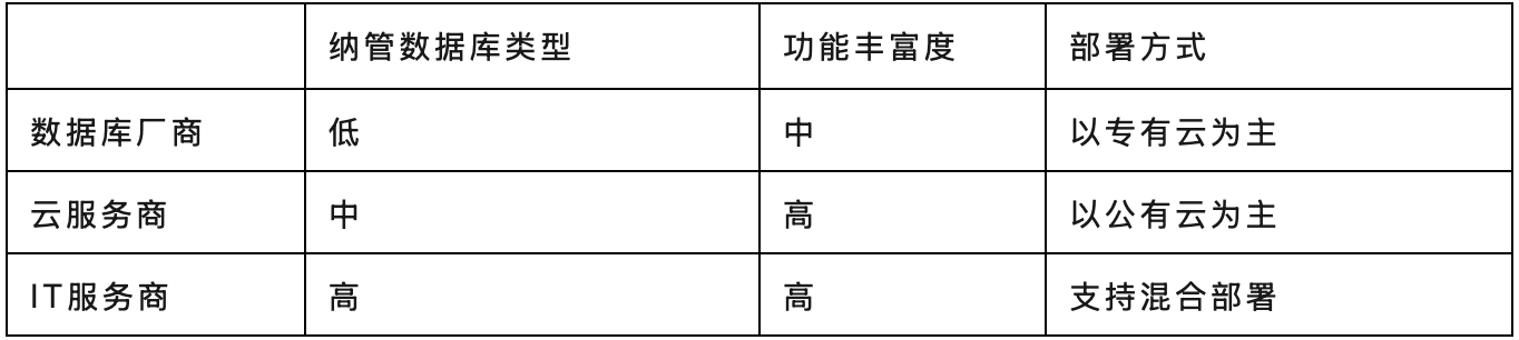 数据库管理平台是指面向数据库管理员、数据库开发人员或IT管理人员,为应对企业混合多元的数据库环境,实现数据库安装部署、开发、维护、优化的全生命周期统一管理,以提升工作效率和管理质量的软件系统。通过引入数据库管理平台,企业可以实现数据库资源整合、敏捷智能运维以及后续技术路线的平滑迭代演进。提供数据库管理平台产品的企业通常分为三种,即独立的数据库厂商、公有云厂商和以提供数据库服务为主的IT服务商,其提供的数据库管理平台通常具有如下特点。