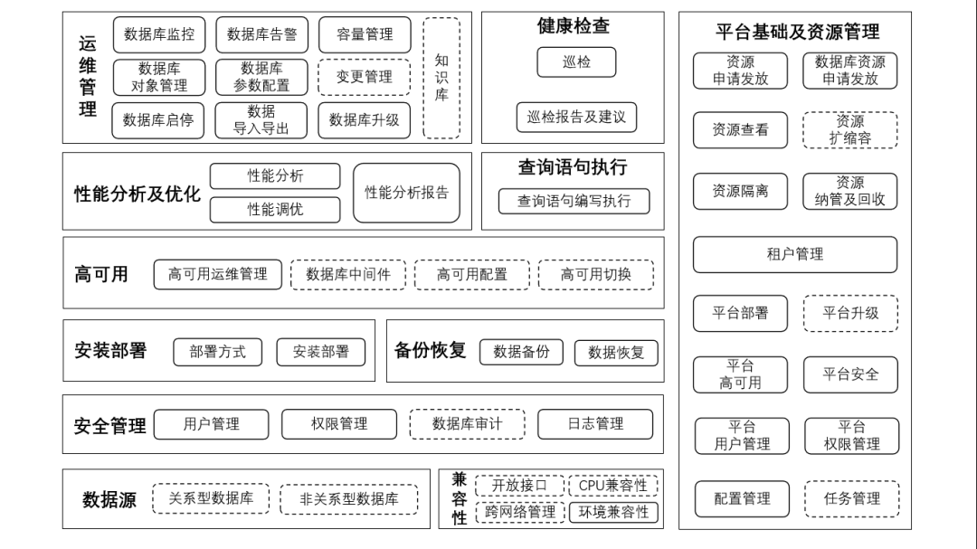 从功能实现层面看,数据库管理平台应该支持安装部署、性能分析及优化、健康检查、高可用、运维管理、备份恢复、安全管理、查询语句执行、平台租户管理、兼容性、平台基础能力和平台资源管理能力等主要功能。
