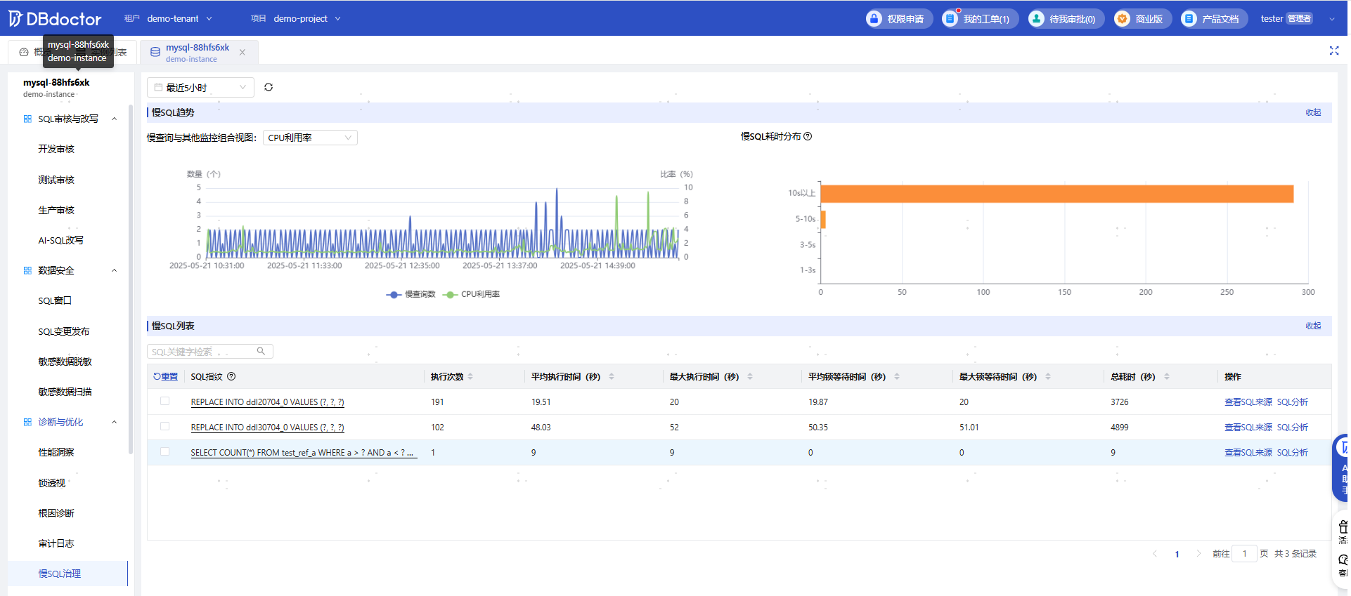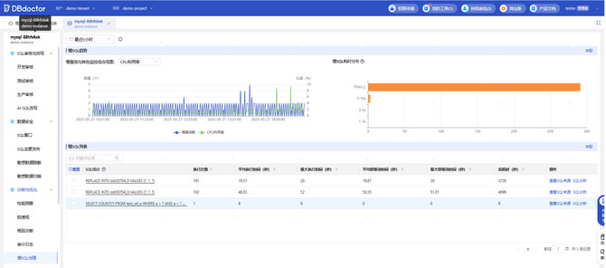 DBdoctor不仅拥有强大的慢SQL治理和AI SQL改写功能,更是一个全方位的数据库智能诊断平台,具备性能洞察、锁透视、SQL审核、数据库监控与数据安全等功能。近期新上线的智能问答小助手,可快速进行数据库实例诊断并给出运维建议,降低诊断门槛: