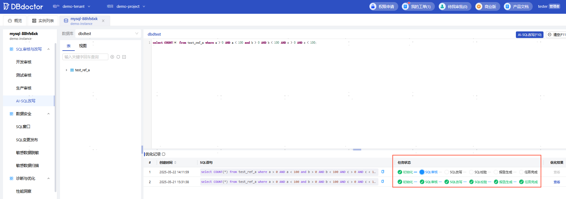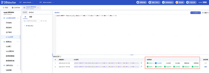 这是DBdoctor此次升级的核心亮点!AI-SQL改写引擎结合大语言模型能力,能够深入理解业务语义和执行上下文,准确把握SQL的应用场景和目标。内嵌自研SQL审核引擎,依据规则进行严格的合规与性能审查,确保改写后的SQL既符合实践,又能提升性能。接入自研Cost优化器,从成本效益的角度出发,自动评估并选择成本最优的SQL写法。