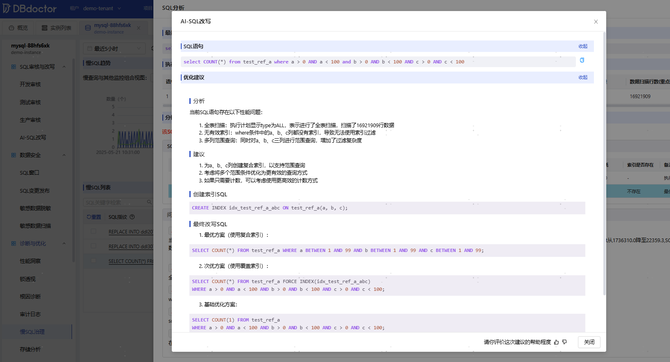 DBdoctor一直致力于为广大用户提供数据库性能诊断与优化解决方案,如今借助AI大模型技术更是实现了华丽升级,在慢SQL治理上取得了质的飞跃,为数据库性能优化带来了全新突破。