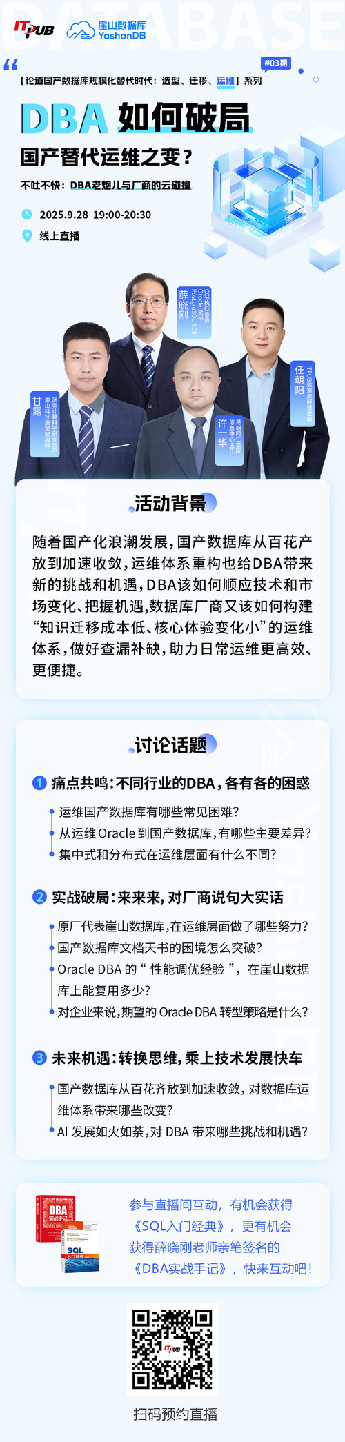 第三期收官直播围绕《DBA如何破局国产替代运维之变?》展开,由IT168 数据库频道主编任朝阳主持,邀请CCF执行委员&Oracle ACE&PostgreSQL ACE薛晓刚、昆明同仁医院信息中心主任&云南省医院协会信息管理专委会委员&云南省计算机学会数字医疗专委会委员许一华作为DBA老炮儿代表;深算院&崖山科技资深架构师甘露作为国产数据库厂商代表,在双节到来之际来一场DBA老炮儿与厂商的云端大碰撞。点击预约上方直播,希望借助这场直播,为在数据库行业搬砖的你带来一些启发和力量。