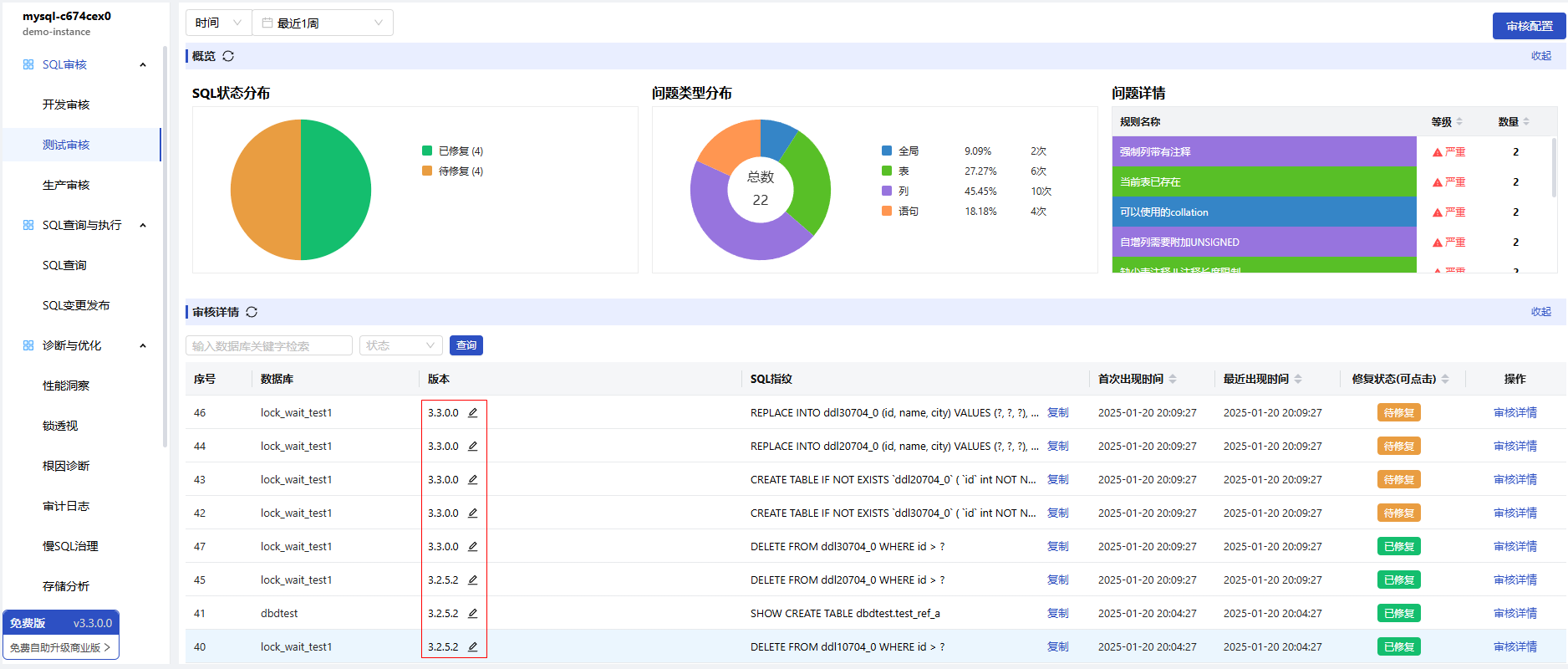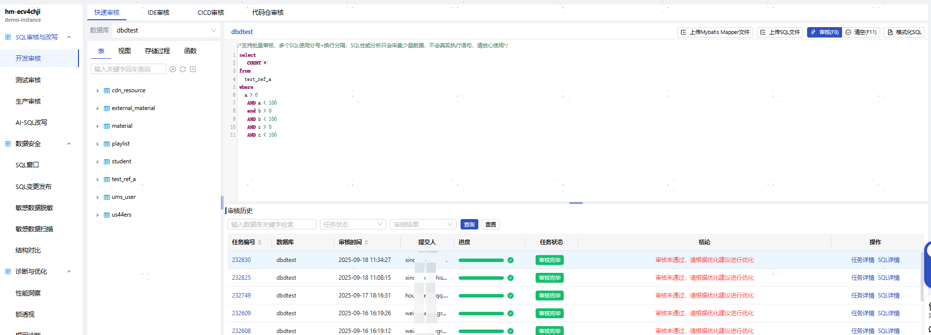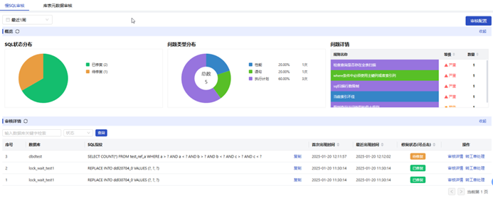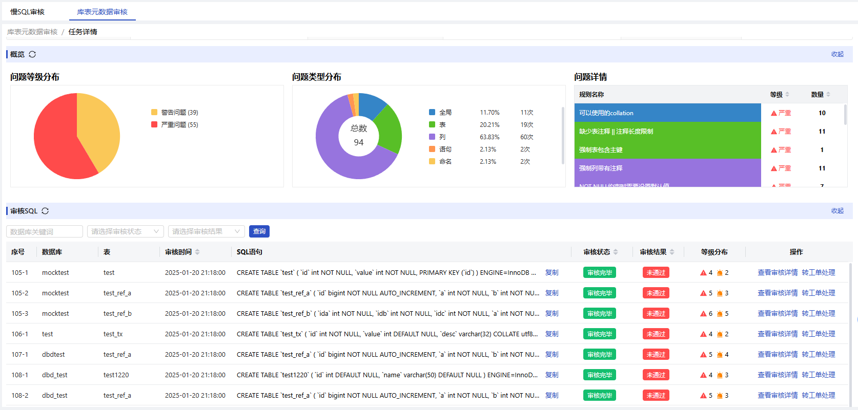 对存量建表语句进行全量审核,确保所有表结构符合规范。运维人员可通过工单流程分配问题 SQL,跟踪整改进度,闭环管理。