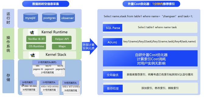 基于真实数据建模,通过eBPF技术动态采集生产环境的数据分布特征;无需修改数据库内核,外置架构通过旁路解析SQL执行计划,无需调整数据库源码或配置,1分钟完成索引推荐与改写建议,对业务完全透明。