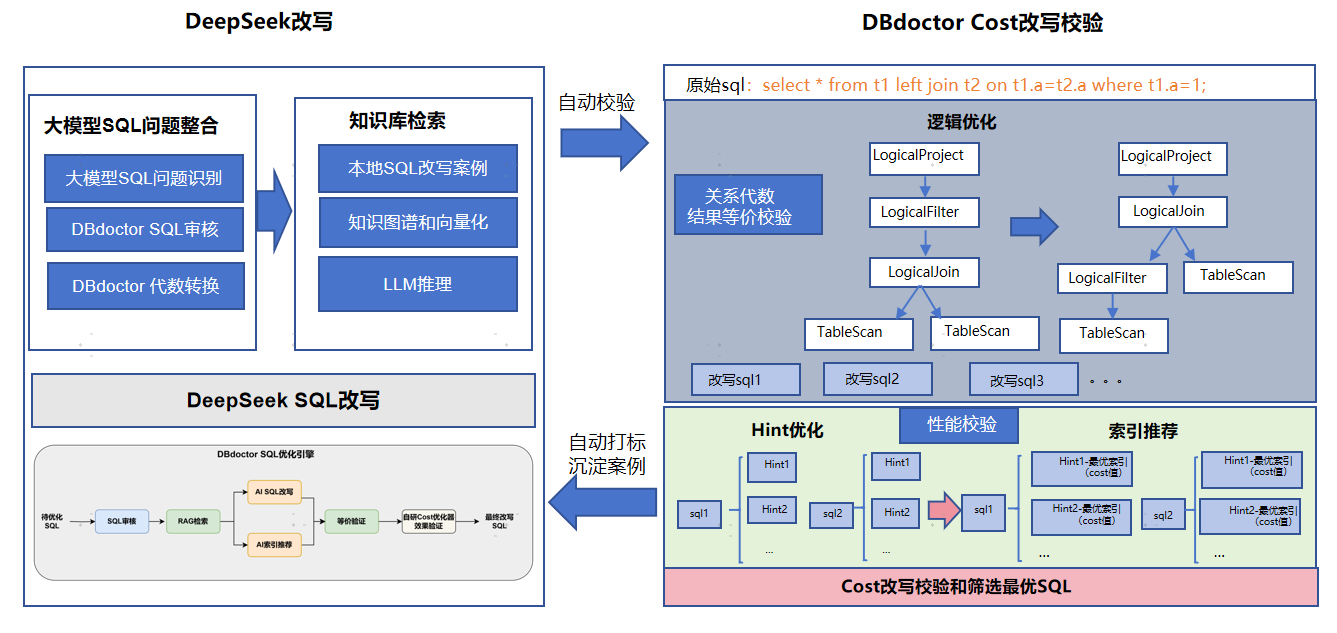 DBdoctor创新性地推出SQL改写智能体,依托内核级精准诊断数据和大模型能力,智能生成SQL改写建议。创新性地结合SQL标准算子关系代数运算,实现SQL等价性自动校验,并通过自研外置Cost模块进行性能评估,确保推荐最优改写方案。同时,系统基于真实线上案例不断沉淀知识库,自动持续提升SQL改写的准确率和智能化水平。