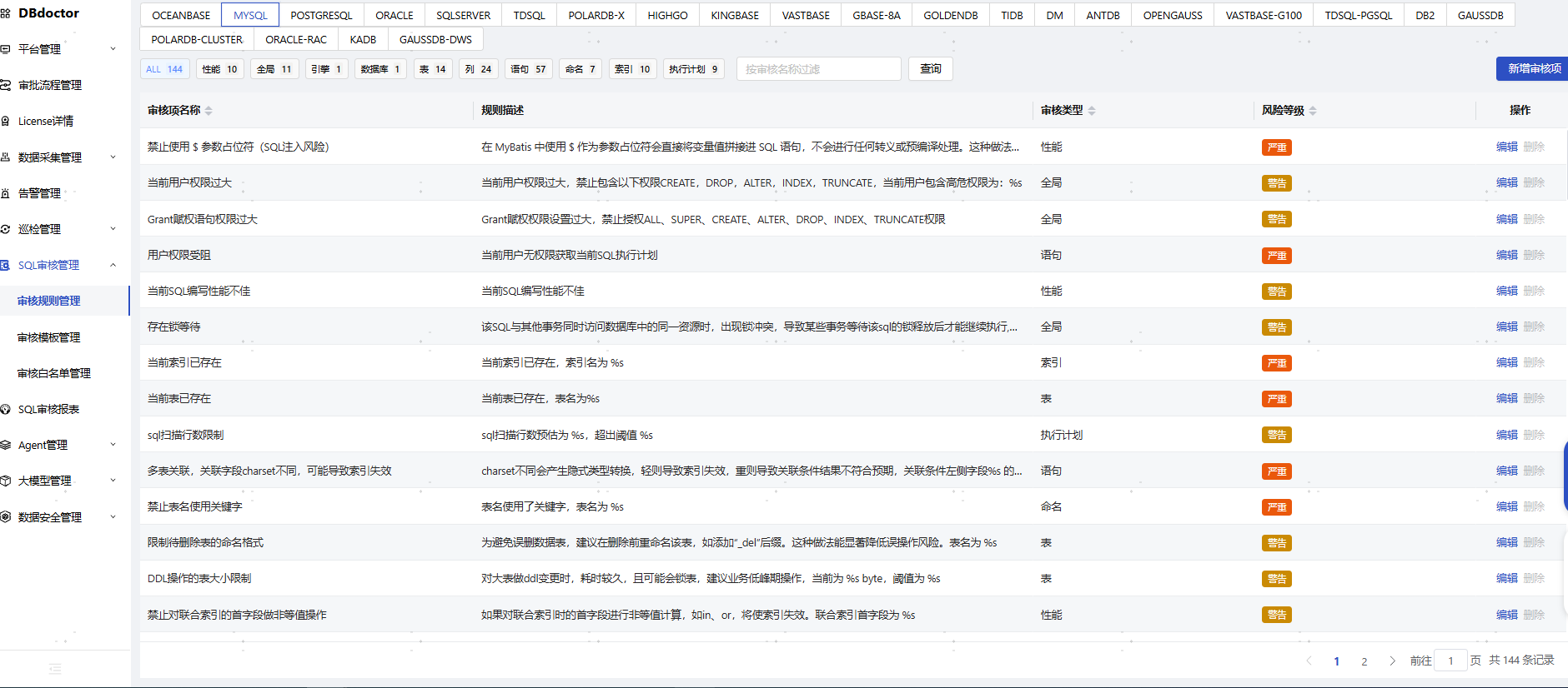 DBdoctor内置2000多条审核规则,覆盖SQL开发规范、安全、可维护性和性能等多个方面,支持20余种主流数据库引擎,满足企业多样化的数据库管理需求。