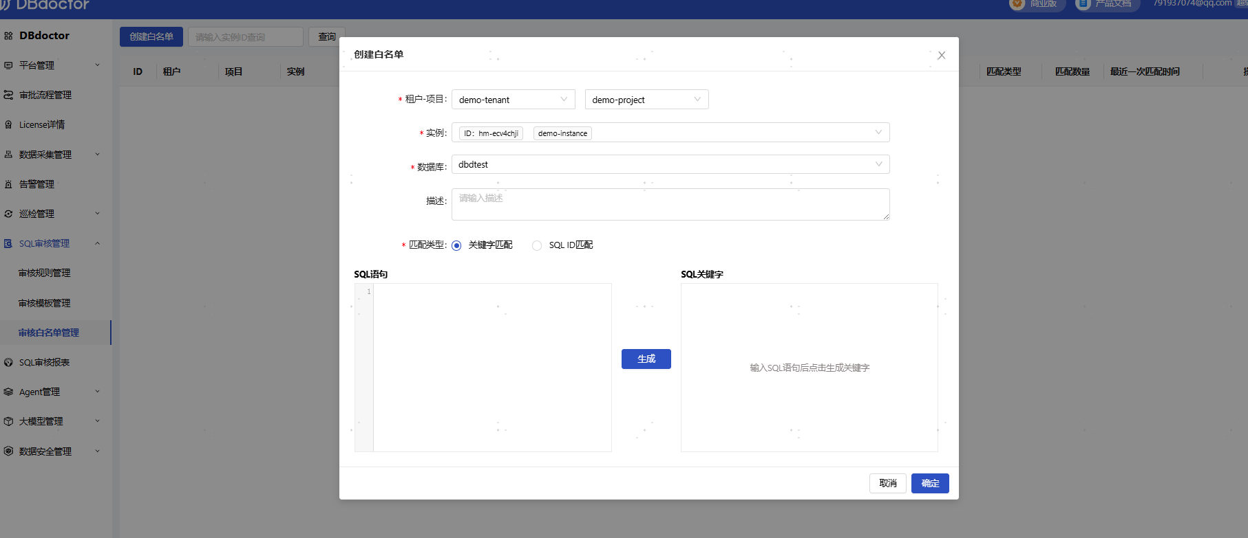审核白名单功能:支持针对指定的SQL语句不进行审核,有效减少误报和重复处理,提高审核效率。