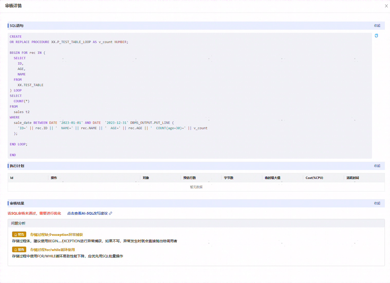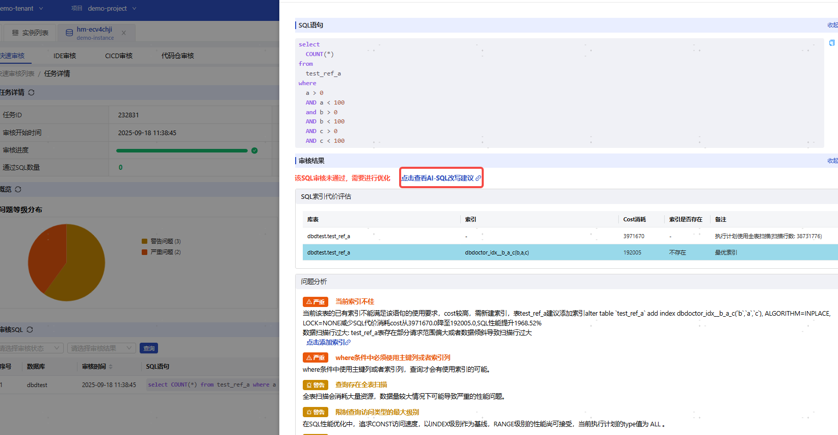 在 SQL 窗口输入待审核语句,一键触发审核,立即获得详细结果。针对未通过的 SQL,可直接查看 AI-SQL 改写建议。