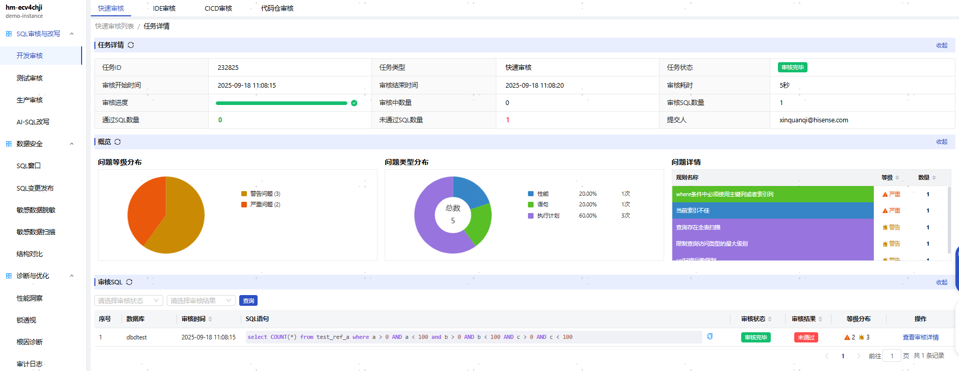 DBdoctor支持SQL变更工单的自动审核。开发人员提交工单后,系统会自动对SQL语句进行规范性、安全性和性能等多维度检测,并及时反馈问题,协助开发人员快速修正,提升审核效率和变更质量。