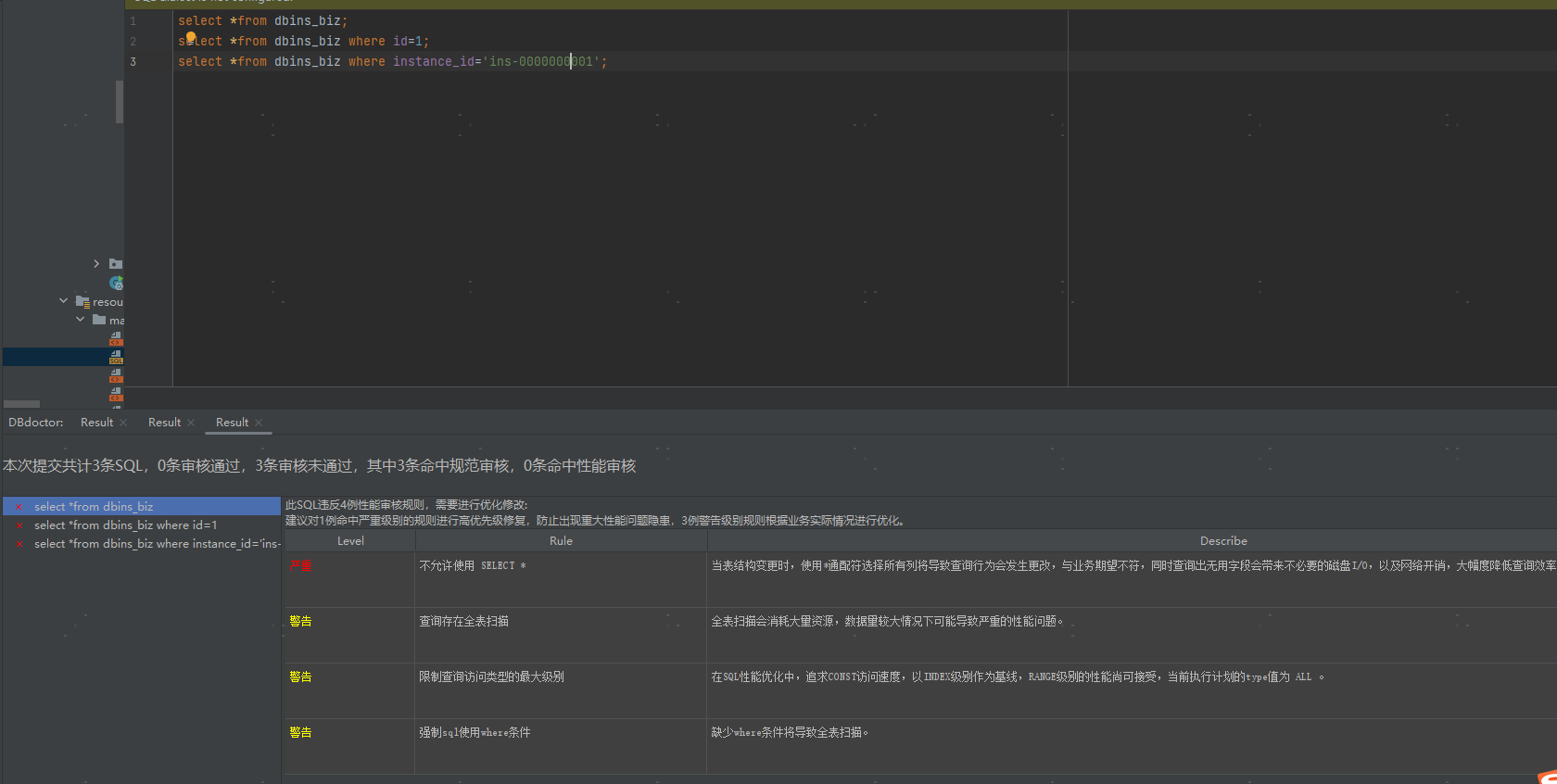通过插件集成到主流 IDE,开发人员在编写 SQL 或 DAO 层代码时,实时获得审核反馈,及时发现和解决问题。