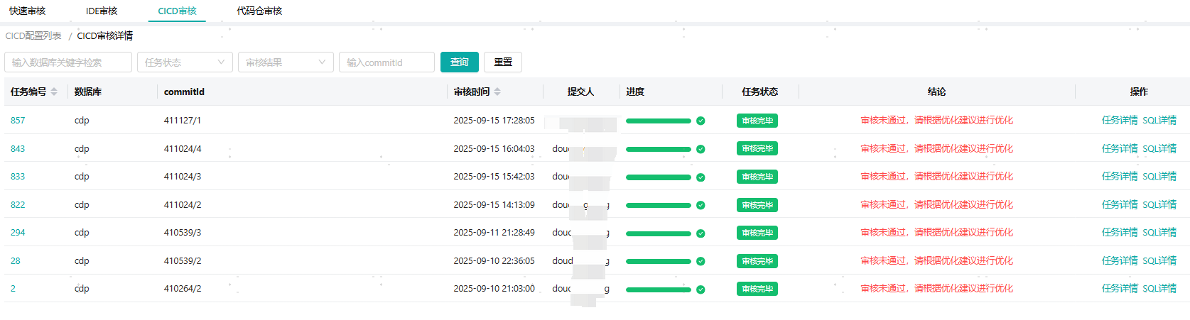 将 SQL 审核能力集成到 CICD 流水线,每次提交自动检查 SQL 代码,确保规范执行,杜绝问题上线。