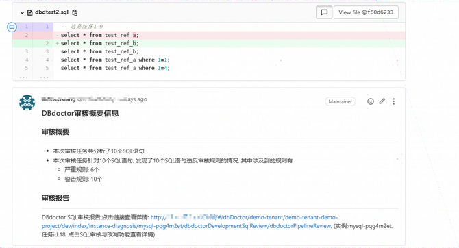 当提交SQL到代码仓库时,DBdoctor的SQL审核能力还可以直接对接代码仓的WebHook,当提交的代码中发生SQL变动时 ,代码仓可将变动对接至DBdoctor平台,对发生变动的SQL文件进行审核。自动检查本次提交的SQL代码,并将SQL审核结果以Comment的形式展示给用户。