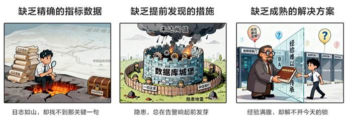 • 可见性不足:传统指标无法回答“为什么这个SQL慢?”的根本问题。是网络延迟?锁等待?磁盘I/O?还是优化器选错了索引?