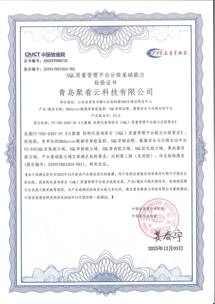 近日,数据库性能诊断DBdoctor,已顺利通过中国信息通信研究院(以下简称“中国信通院”)《大数据结构化查询语言(SQL)质量管理平台能力分级要求》的专项能力评估,荣获最高等级——“先进级”认证。尤为重要的是,DBdoctor是该项评估中首家以满分成绩获此认证的产品,这标志着其在SQL质量管理的技术完备性与实践成熟度上已达到行业引领水平。