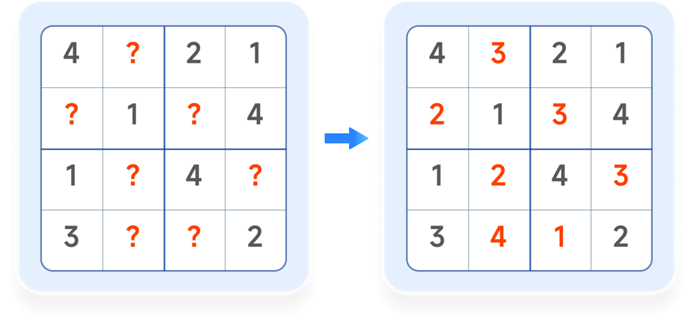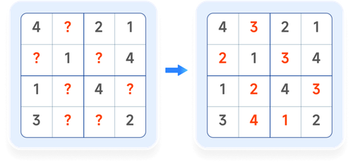 在 4×4 方格内填入 1-4 的数字,要求每行每列和上下、左右每小组的 4 个数字不能重复。
