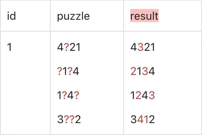 · 使用一条 SQL 给出如下图结果。字段 id 为自增字段的数字主键,字段 puzzle 是题目内容,由 4×4 个数字组成,问号表示未知的数字,其中 result 字段是选手需要给出数独的解。