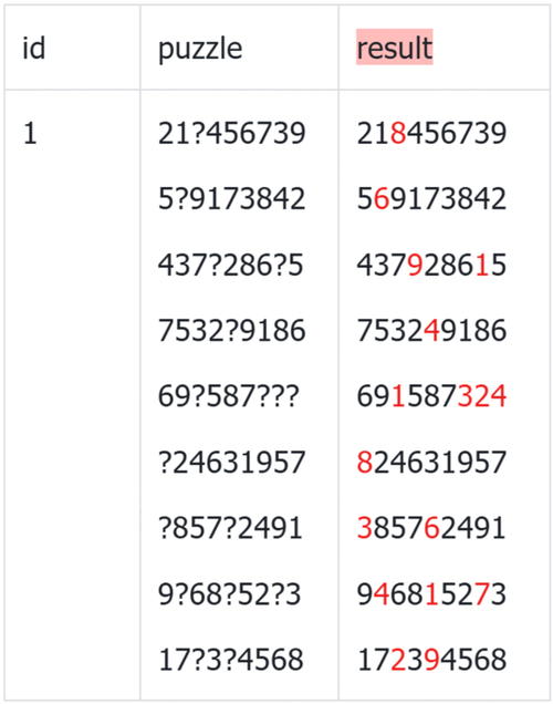 · 使用一条 SQL 给出如下图的结果。字段 id 为自增字段的数字主键,字段 puzzle 是题目内容,由 9×9 个数字组成,问号表示未知的数字。其中 result 字段是选手需要给出数独的解。