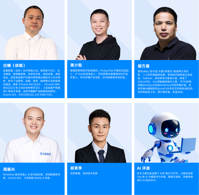 本次大赛的评委,均是数据库领域的领军人物,通过主办方 NineData 的邀请,组成 2025 年第三届《数据库编程大赛》强大的评审嘉宾团。