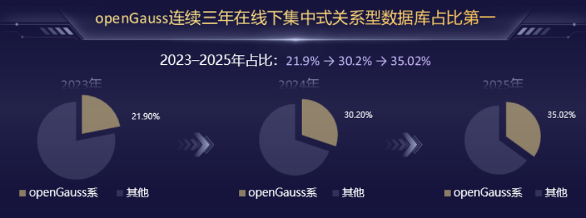 市场认可度显著提升:根据第三方机构沙利文报告的最新数据,openGauss在中国线下集中式关系型数据库市场的份额呈现持续快速攀升的态势,从2023年的21.9%增长至2024年的30.2%,并进一步在2025年达到35.02%,三年持续领先,实现三连冠。同时,在整个中国关系型数据库市场中,基于openGauss的数据库商业发行版占比也已跃升至29.4%,成为国内开源数据库生态的领先力量。