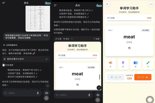 新集成的近20项API工具可支持生活规划、教育学习、创意互动等多元场景,助力用户构建功能更复杂的个性化应用。例如,借助LLM调用能力,用户可快速创建AI面试官(模拟产品经理、电商运营等角色进行对话训练)、节日祝福生成器(以特定人物口吻提供趣味互动)等对话类应用;实时搜索API则支持接入GDP、天气、商品价格等结构化数据,使工具具备动态信息处理能力。在娱乐互动领域,陀螺仪、音效合成与震动反馈等能力的加入,为小游戏和模拟类应用注入沉浸式体感交互。用户在游戏得分、通关等节点可触发定制音效与物理反馈,结合个性化能力组合,打造专属互动体验。