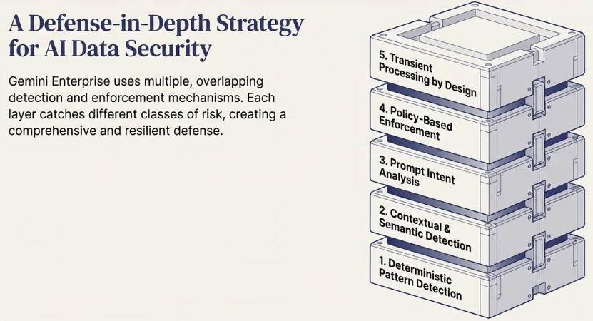 Gemini Enterprise采用多种重叠的检测机制。每一层都能捕获不同的风险类别,它们共同构成纵深防御。