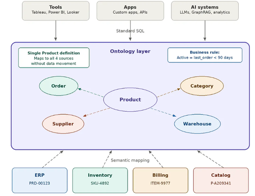 语义本体层将不同的源系统统一到一个单一的业务词汇下,将标准 SQL 暴露给 BI 工具、应用程序和 AI 系统,而无需数据移动或模式整合。