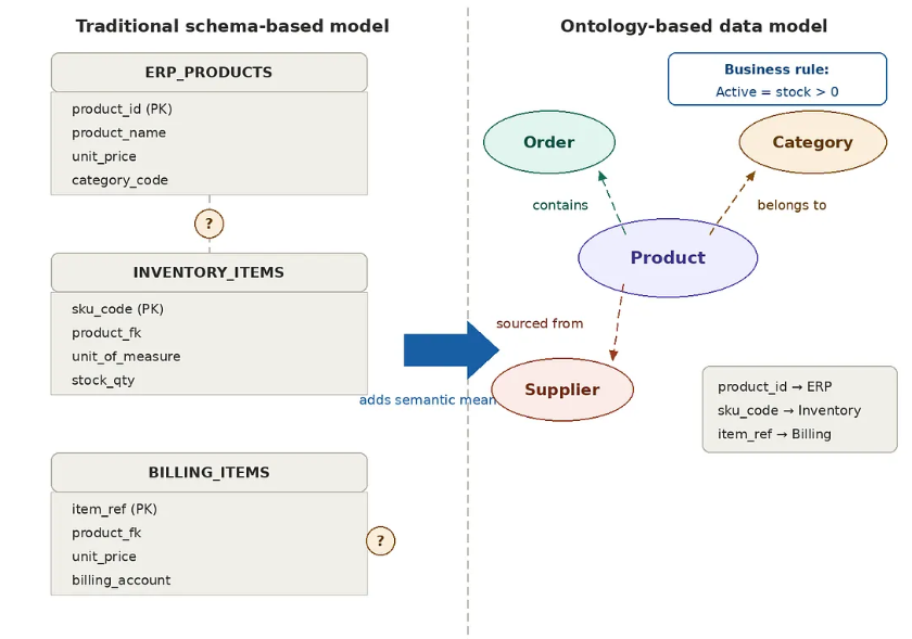 传统的基于模式的方法依赖于表结构、命名约定和逻辑连接来捕捉业务含义,并假设这些约定就足够了。基于本体的模型则采取不同的立场:关系被明确声明并进行语义命名。