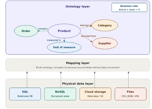本体显式地编码业务含义。它们作为可重用的语义层位于物理存储(数据库、数据仓库、数据湖)之上,无需重复数据即可实现知识图谱、语义搜索和人工智能工作流。