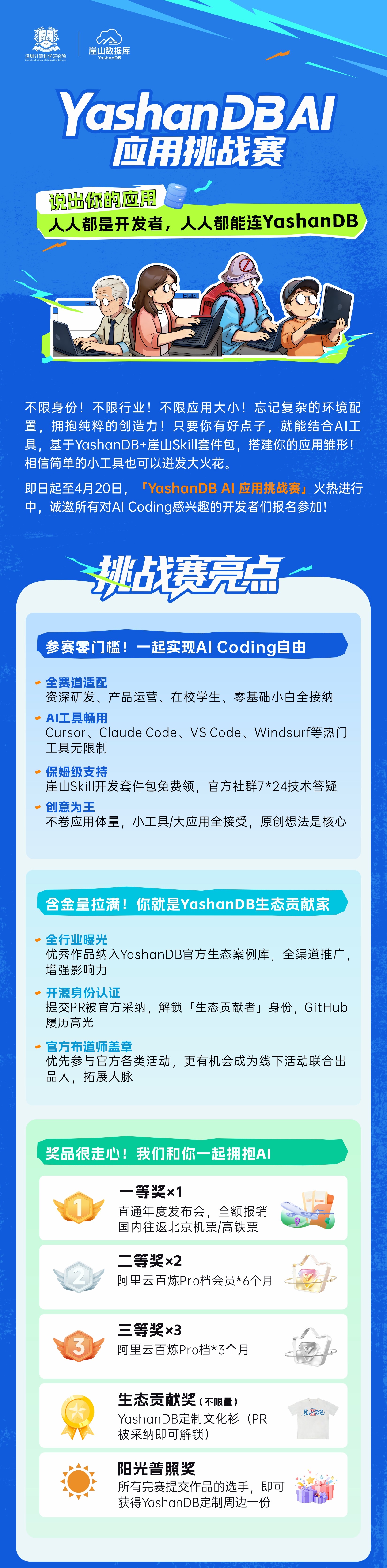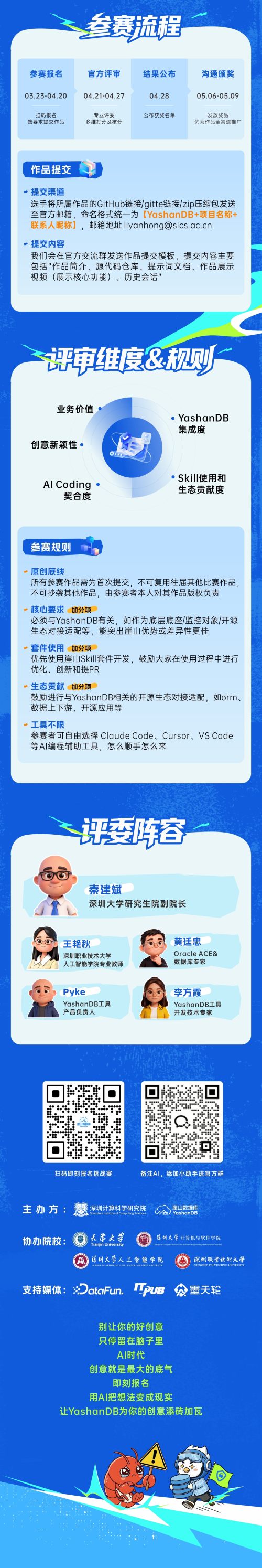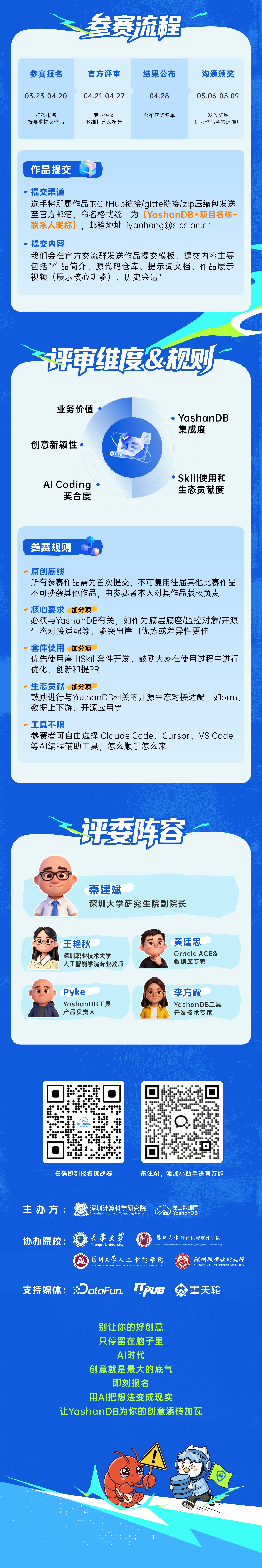再次提醒报名参赛的小伙伴,本次参赛作品需以YashanDB为核心底座,突出崖山优势/差异性更佳;优先使用崖山开源Skill套件开发,鼓励优化提PR;鼓励进行与YashanDB相关的开源生态对接适配,感谢每一位YashanDB的生态贡献家!