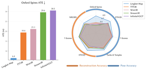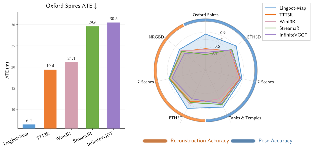 (图说:LingBot-Map 在多项国际主流评测中全面领先现有方法,是目前精度最高、稳定性最强的流式三维重建模型)