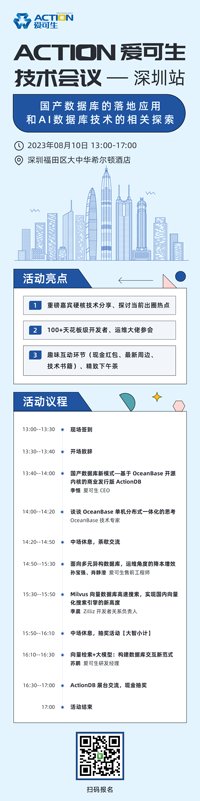 2023年8月10日,爱可生将在深圳开启技术会议第一站“国产数据库的落地应用与AI数据库技术的相关探索”,届时,我们将邀请 OceanBase 技术专家、Zilliz 开发者关系负责人与开发者们共同探讨数据库新趋势。